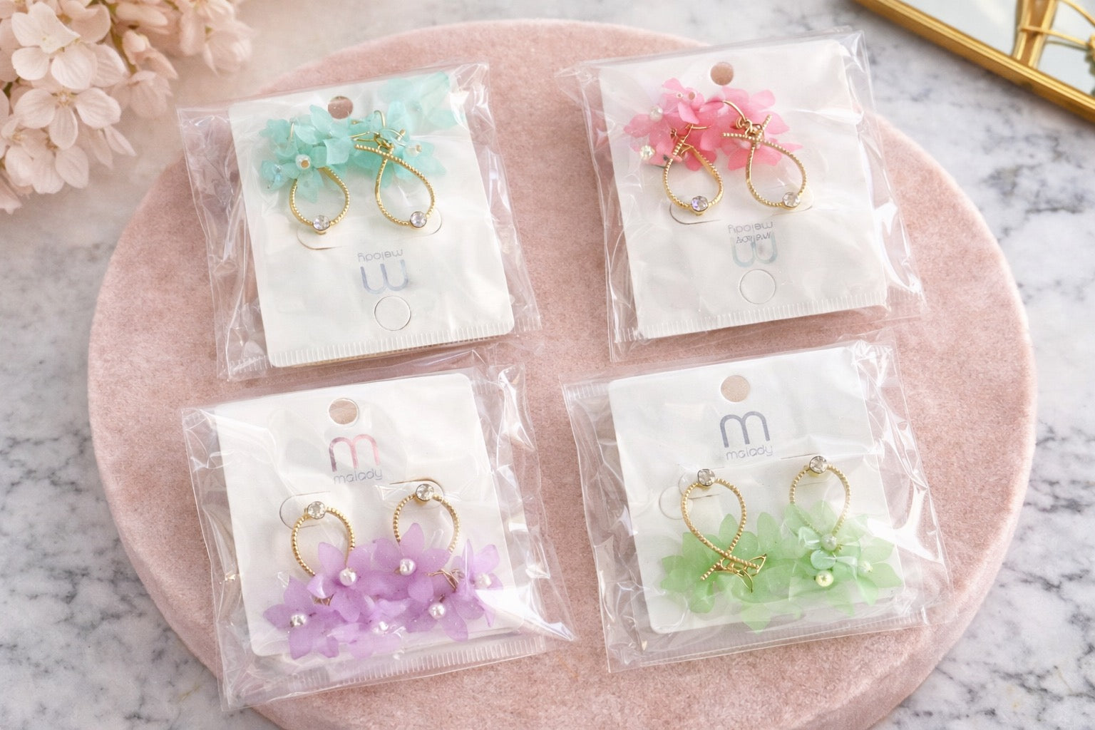 Item: Pastel Floral Drop Hoop Earrings (Gold Tone)